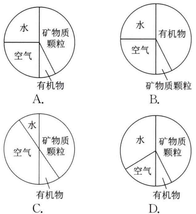 3. (宁波期中)玉米等旱地作物适宜在较干燥的土壤中生长。如果种植在湿润的土壤中,因水分所占的比例过大,将导致植物的根不能正常呼吸而腐烂,俗称“霉根”。在下列土壤中种植玉米,最有可能导致玉米因“霉根”而死亡的是 (