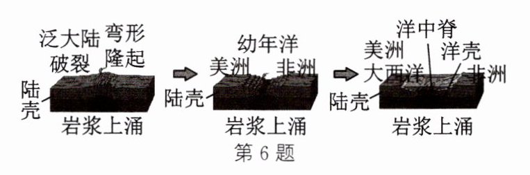 6. 如图所示为大西洋的形成过程,它所支持的观点是 (