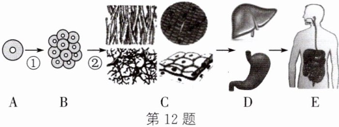 12. 图中,A~E表示人体的不同结构层次,请据图分析并回答下列问题: