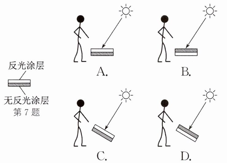 7. (温州期末)反光板是摄影常用器材,其一侧表面涂有光滑的反光涂层,可以反射光;另一侧无反光涂层,通常为黑色(如图)。下列反光板的摆放方式中,能使拍摄对象的面部更亮的是(