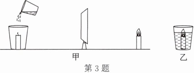 3. (杭州期末)如图所示为神奇的“魔术”——浇不灭的蜡烛实验(图甲):实验时准备两支蜡烛,点燃半透明的玻璃板前的蜡烛,玻璃板后面未点燃的蜡烛放在烧杯内。向烧杯内慢慢加水,透过玻璃板看到蜡烛火焰并没有被水浇灭(如图乙)。下列做法中,会导致“魔术”不成功是(