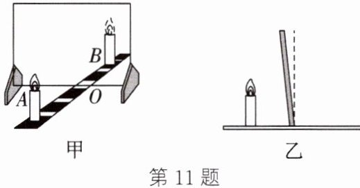 11. 如图甲所示,小红选择一根直尺、两支大小相同的蜡烛、平板玻璃、白纸进行实验,来探究平面镜成像的特点。将玻璃板竖直放在水平桌面上,再取两支相同的蜡烛A和B竖直地放置于玻璃板前后,点燃玻璃板前的蜡烛A,移动蜡烛B,直到看上去蜡烛B与蜡烛A的像完全重合。在此实验中: