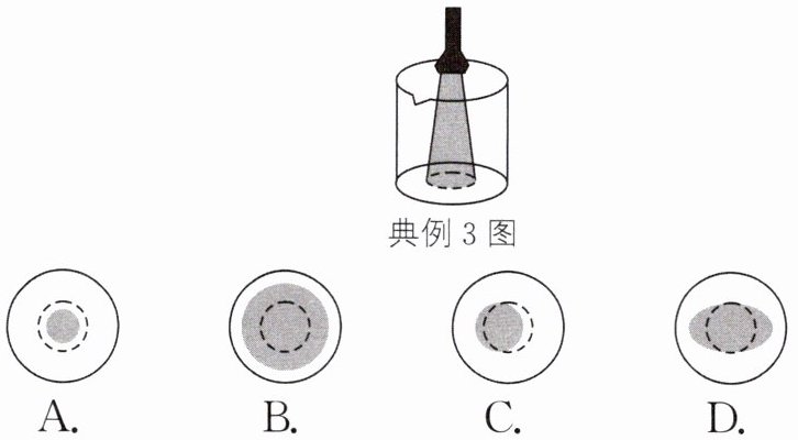 典例3(宁波模拟)如图所示,将手电筒发出的发散光束竖直向下照射到空烧杯底部时,可观察到烧杯底部的一个圆形光斑(用虚线表示)。在其他条件不变的前提下,若再向烧杯中注水到一定高度时,烧杯底部的光斑形状是( )