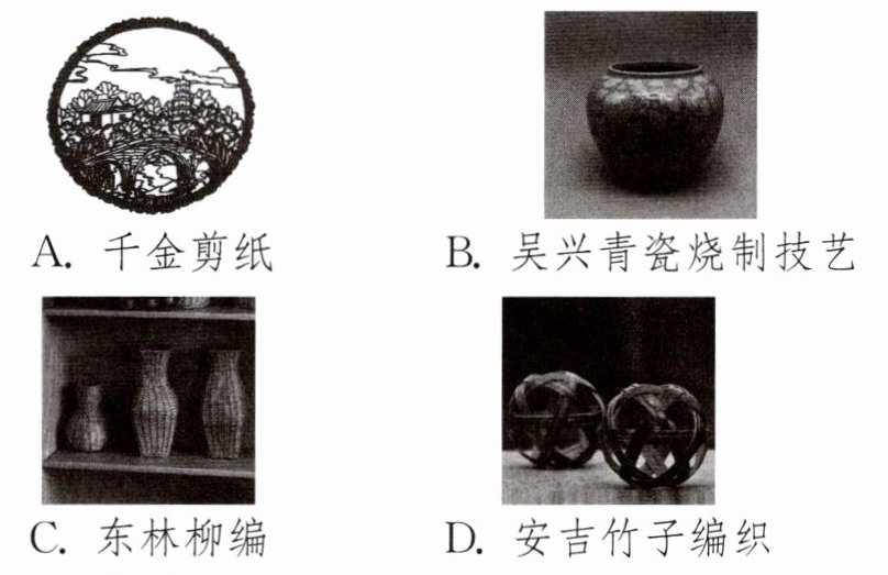 B 解析:千金剪纸、东林柳编、安吉竹子编织的过程只是改变了纸张、柳条、竹子的形状,没有新物质生成,属于物理变化,不符合题意;在青瓷烧制过程中,泥土经过高温发生了复杂的化学变化,生成了新的物质,这属于化学变化,符合题意。
