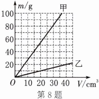 8. 如图所示为甲、乙两种物质的质量与体积的关系图像,由图像可知(
