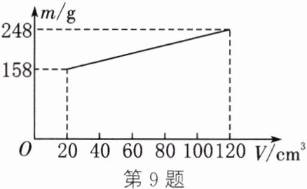 C解析:设空烧杯的质量为$m_{杯}$,液体的密度为$\rho$,读图可知,当液体的体积$V_{1}=20cm^{3}$时,液体和烧杯的总质量$m_{总1}=m_{1}+m_{杯}=158g$,可得$\rho×20cm^{3}+m_{杯}=158g$ ①,当液体的体积$V_{2}=120cm^{3}$时,液体和烧杯的总质量$m_{总2}=m_{2}+m_{杯}=248g$,可得$\rho×120cm^{3}+m_{杯}=248g$ ②,② - ①得液体的密度$\rho=0.9g/cm^{3}$,代入①得$m_{杯}=140g$。