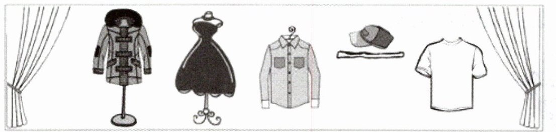 1. a coat 2. a dress 3. a shirt 4. a cap 5. a T-shirt
