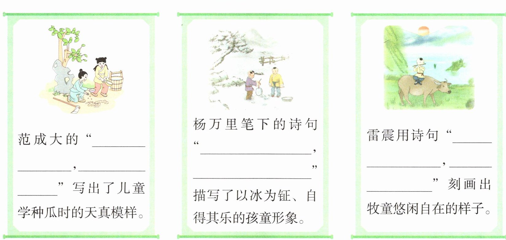 童孙未解供耕织 也傍桑阴学种瓜 稚子金盆脱晓冰 彩丝穿取当银钲 牧童归去横牛背 短笛无腔信口吹