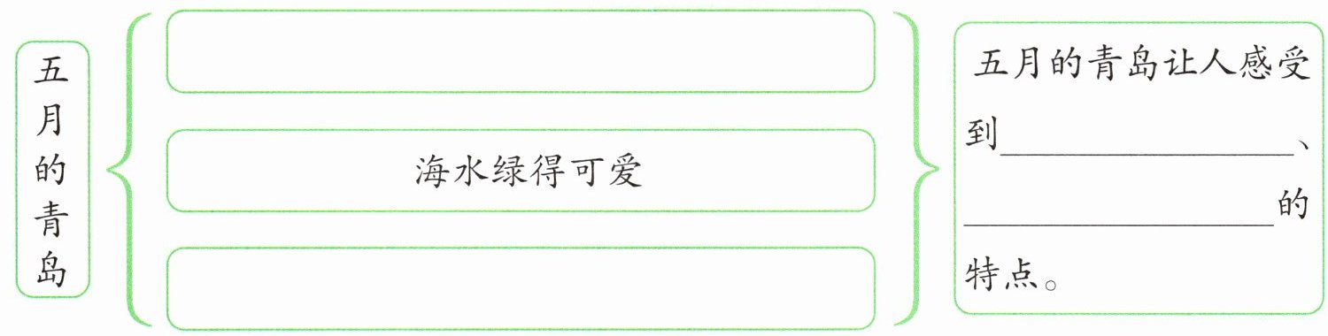 1.B 2.C 3.C 4.从左到右:花草繁茂且芳香四溢 人们的活动丰富多彩 生机勃勃 景色迷人 5.句子运用动态描写,写出了海水绿意无限的特点,表达了作者对青岛五月的海的喜爱之情。