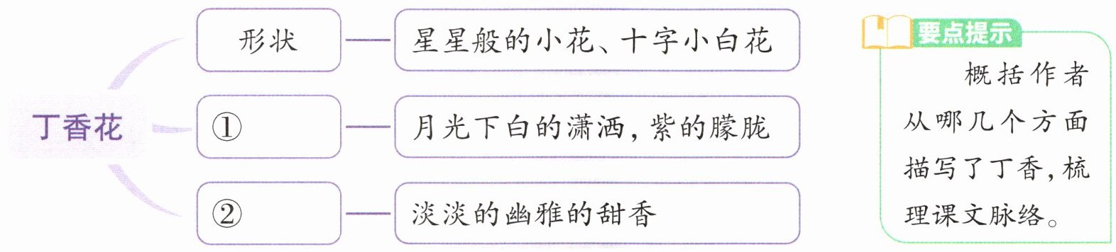 5 阅读第1~3自然段,想一想作者是从哪几个方面来描写丁香花的,填一填。