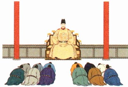 联系右图影视剧中古代群臣朝拜皇帝的情景,大致可以猜出“拱伏无违”的意思是____。