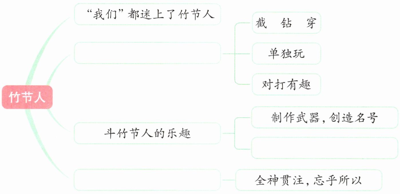 4 课文第______自然段描写了"我们"课下玩竹节人的热闹情景;第______自然段描写了"我们"课上玩竹节人时入迷的情景,表现出"我们"对玩竹节人的痴迷。如果想要了解竹节人被没收后"我们"和老师心情的变化,应该阅读课文第______自然段。