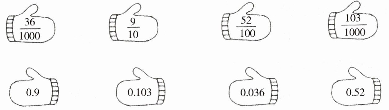 【答案】:$\frac{36}{1000}$与$0.036$相连;$\frac{9}{10}$与$0.9$相连;$\frac{52}{100}$与$0.52$相连;$\frac{103}{1000}$与$0.103$相连。