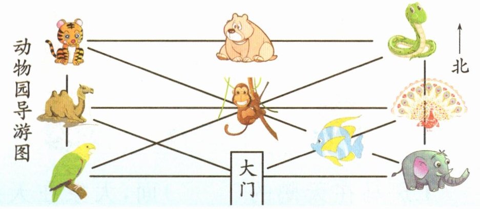 2. 动物园的西南角是(鸟)馆,东北角是(蟒蛇)馆。