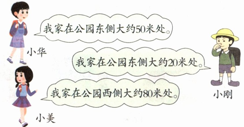 小刚家和小美家,一家在东,一家在西,两家距离为$20+80 = 100$米。