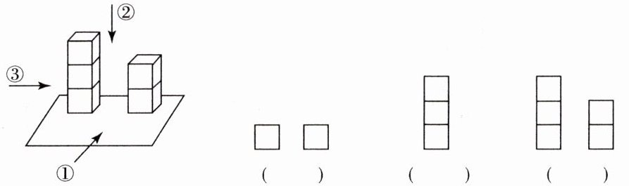 2. 下面的平面图形分别是从立体图形的什么位置看到的?把编号写在相应图形下的括号里。