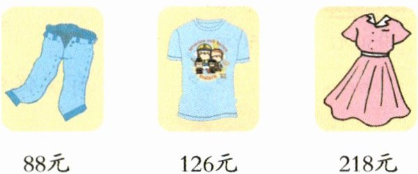 (2) 已知一条裤子$88$元,一件连衣裙$218$元,求买一条裤子和一件连衣裙一共需要的钱数,用加法计算,即$88 + 218 = 306$(元)。