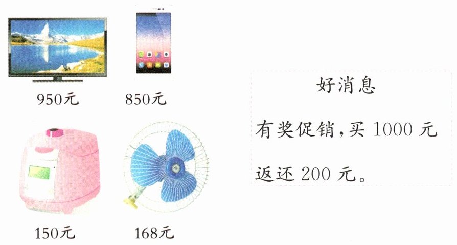 (2) 要购买商品数量最多,应优先选择价格低的商品。先选价格最低的电饭煲$150$元,电风扇$168$元,再看剩下的钱能否买其他商品。$150 + 168 = 318$(元),$1000 - 318 = 682$(元),$682\lt950$,$682\lt850$,若买电视或手机,花费$950$或$850$,加上前面的$318$都超过$1000$,但因为有买$1000$返$200$活动,若买电饭煲、电风扇、手机,总价$150 + 168+850 = 1168$元,返回$200$元后,实际花费$1168 - 200 = 968$元$\lt1000$元。