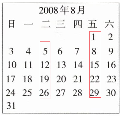 4. 贝贝在8月份的每个星期二和星期五去学游泳,请在右上图中圈出来。