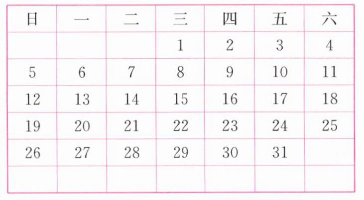 3. 查一查第一题中2008年8月的月历表,看看8月1日是星期几,请你根据这些信息在下面制作2018年8月的月历表。