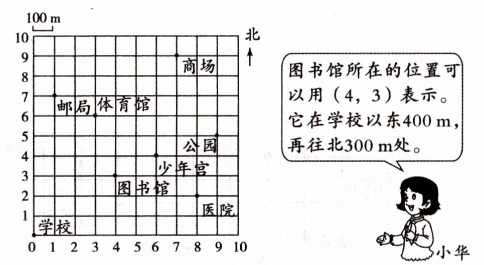 1.像小华那样描述一下其他建筑的位置。(任意两个即可)