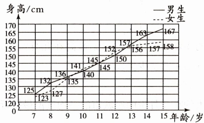 一 下面是某地区7~15岁男生、女生平均身高统计图。