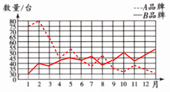 $A$品牌彩电年初销量较高,随后销量呈下降趋势;$B$品牌彩电销量相对比较平稳,且后期有上升趋势。