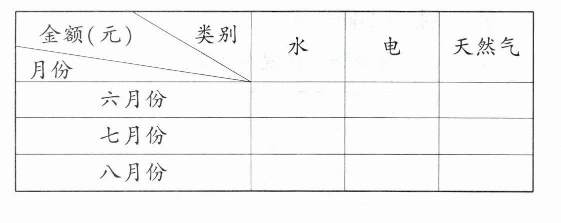 【解析】:我们可以制作一个表格,横向为月份(六月、七月、八月),纵向为费用项目(水、电、天然气)。