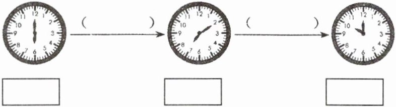 四、先用 24 时计时法在( )里填出午后钟面上的时刻,再在$□$里写出这两个相邻钟面时刻的经过时间。