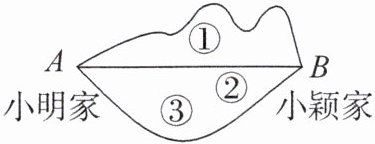 解析:本题考查线段的基本性质。在连接两点的所有线中,线段是最短的,它是在解决最短路径问题时常用的数学原理。题目中小明家到小颖家有三条路,而线路②是线段,根据“两点之间,线段最短”的原理,线路②是最短的路线。