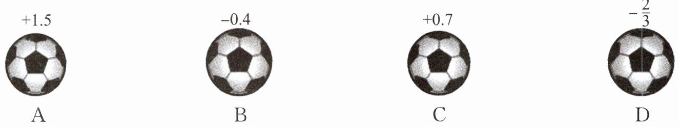 B [解析] 因为$|+1.5|=1.5$,$|-0.4|=0.4$,$|+0.7|=0.7$,$|-\frac{2}{3}|=\frac{2}{3}$,所以$0.4<\frac{2}{3}<0.7<1.5$,所以最接近标准质量的足球是B.【解题技巧】绝对值最小的最接近标准.