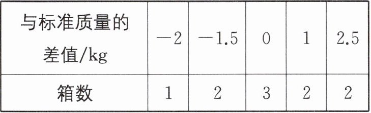 (2)$-2× 1+(-1.5)× 2+0× 3+1× 2+2.5× 2=-2-3+0+2+5=2(\text{kg})$.答:与标准质量相比,这10箱苹果总计超过2 kg.