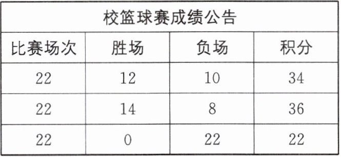 (1)从表中第三行可知,$22$场全负时积分为$22$分,所以负一场积分为$22÷22 = 1$分。