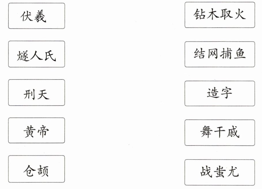 1.伏羲——结网捕鱼 燧人氏——钻木取火 刑天——舞干戚 黄帝——战蚩尤 仓颉——造字