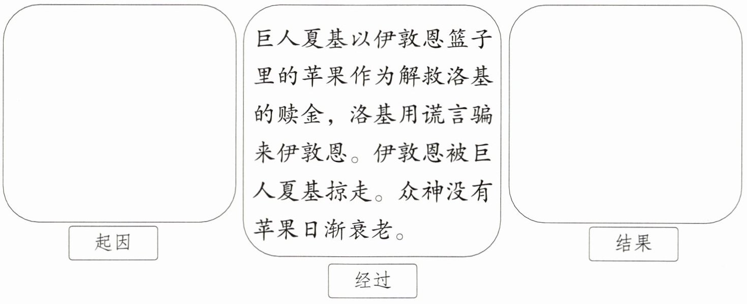 3 青春女神伊敦恩从不离开花园半步。一直以来,她每天要么待在花园里,要么待在花园旁边的金色房屋中。但是有一段时间伊敦恩和她随身携带的苹果一起从阿斯拉加消失了。男女诸神感到衰老日渐来袭,却无可奈何。你知道发生什么了吗?读一读《青春女神和她的苹果》这个故事,试着把故事的起因和结果填在下面。
