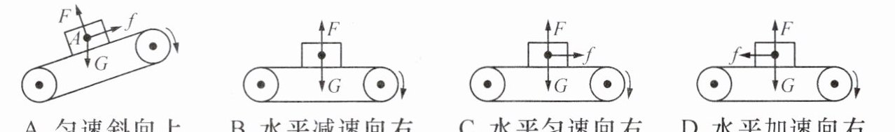 1. 如图,物块A随传送带一起运动(与传送带保持相对静止),当传送带分别处于图示的运动状态时,所画力的示意图正确的是 …………………………………………………………………………(
