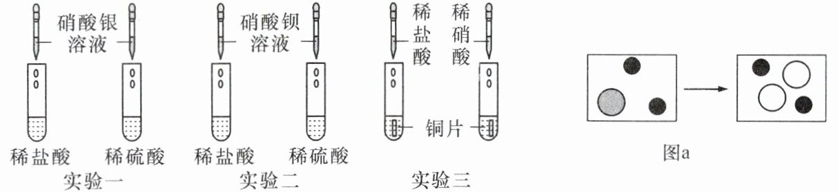 (填离子符号)。(3)实验三稀盐酸中无明显现象;稀硝酸中的现象为铜片逐渐溶解,溶液变蓝,并有气泡产生,反应为${3Cu + 8HNO_{3} = 3Cu(NO_{3})_{2} + 2X \uparrow + 4H_{2}O}$,则X的化学式为