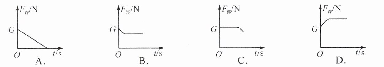2. 将一个重为 G 的鸡蛋放进盛有浓盐水的杯中,鸡蛋漂浮,然后逐渐向杯中加入清水,当鸡蛋下沉至杯底静止时停止加水,如图中的图像能粗略描述这个过程中浮力随时间变化关系的是 …………………………………………………………………………………………… (