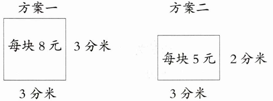 (3) ① $ 3 × 3 × 80 = 720 $ (平方分米) ② $ 720 ÷ (2 × 3) = 120 $ (块) ③ $ 80 × 8 = 640 $ (元) $ 120 × 5 = 600 $ (元) $ 640 - 600 = 40 $ (元) 第二种方案比较便宜,相差 40 元。