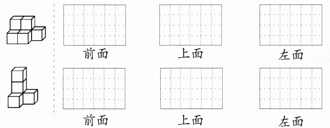 7 下面左侧两个立体图形分别从前面、上面和左面看,看到的形状分别是什么样的?请你在方格纸上画一画。