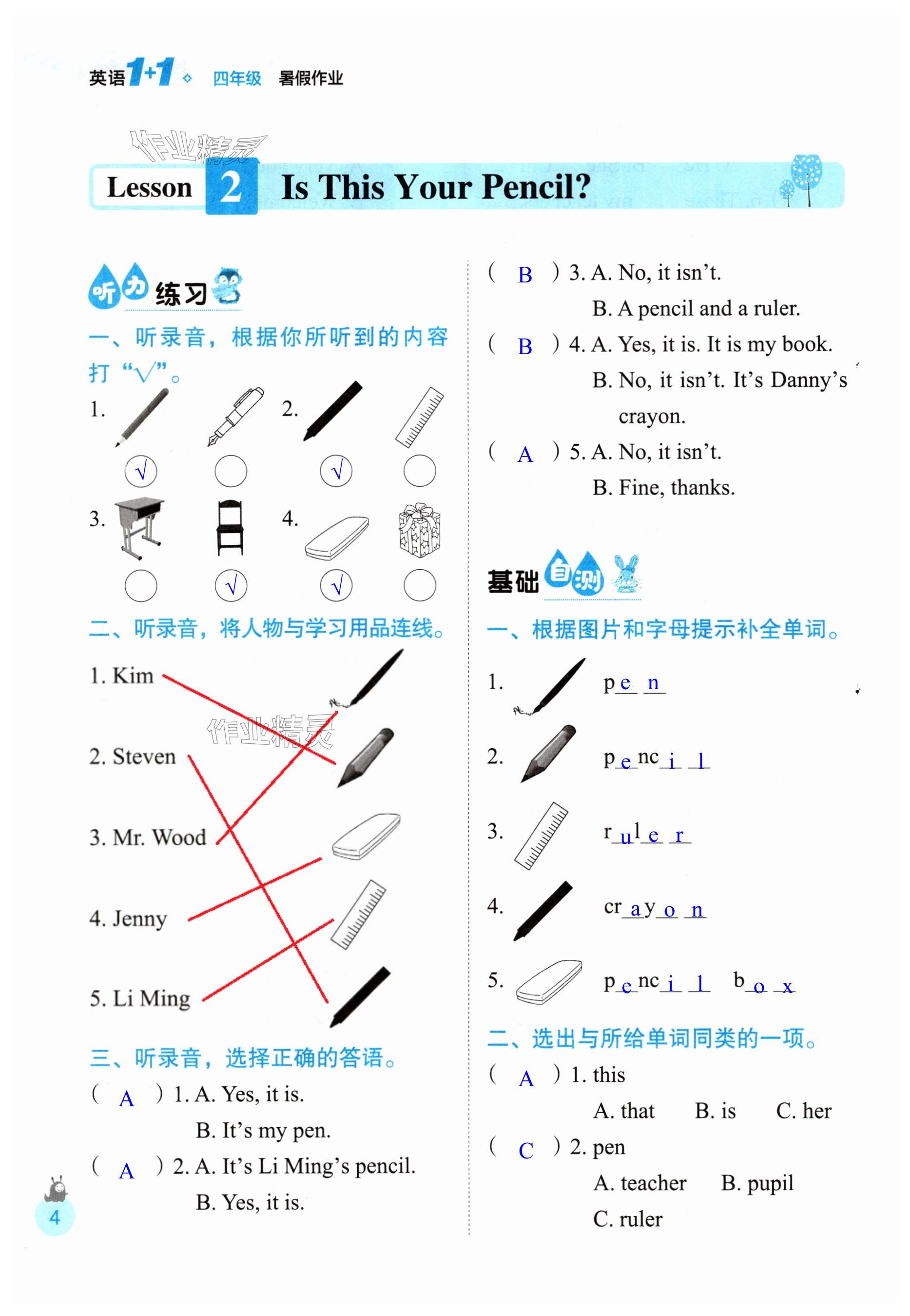 注:目前有些书本章节名称可能整理的还不是很完善,但都是按照顺序排列的,请同学们按照顺序仔细查找。练习册 2025年1+1暑假作业四年级英语 答案主要是用来给同学们做完题方便对答案用的,请勿直接抄袭。