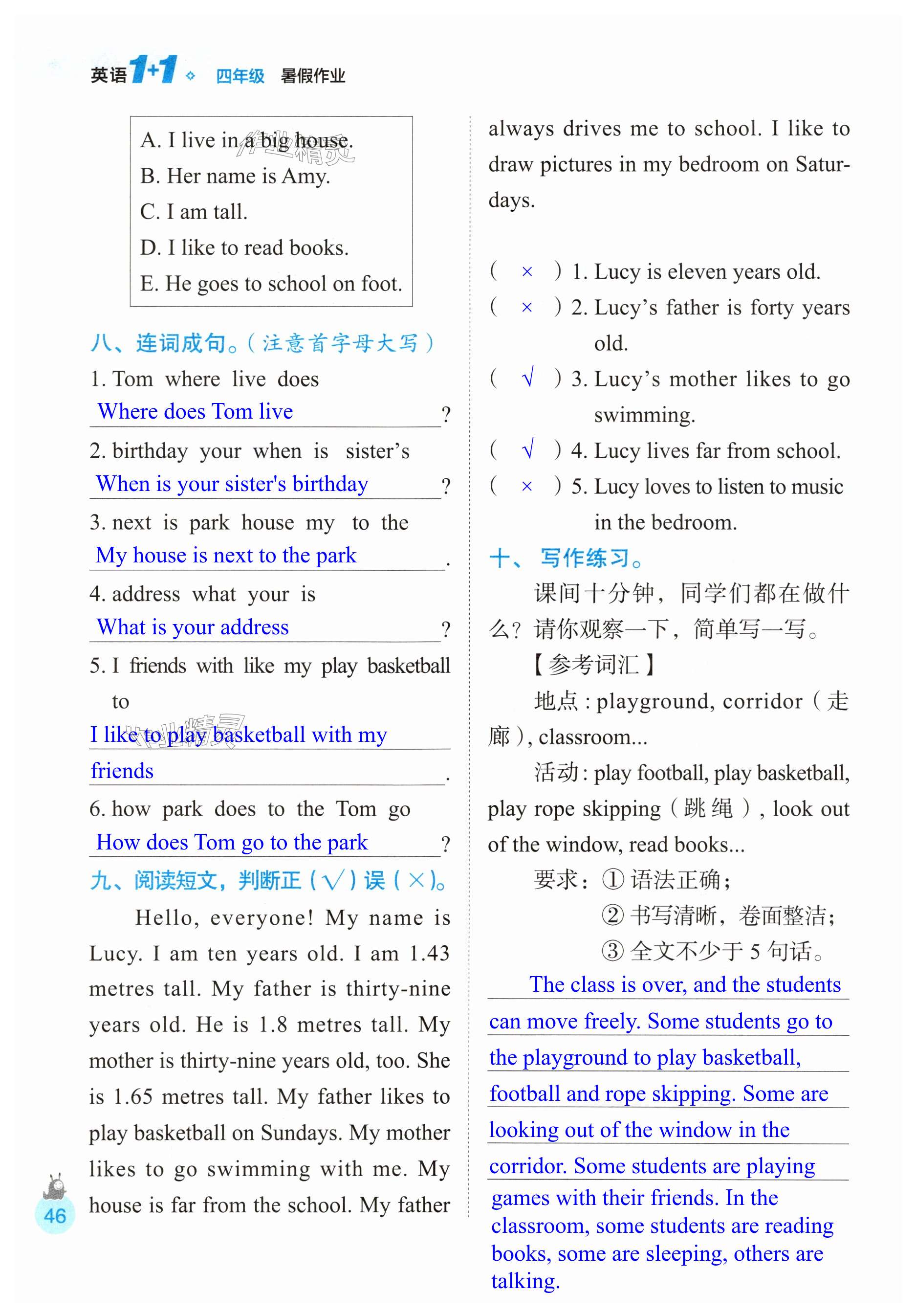 注:目前有些书本章节名称可能整理的还不是很完善,但都是按照顺序排列的,请同学们按照顺序仔细查找。练习册 2025年1+1暑假作业四年级英语 答案主要是用来给同学们做完题方便对答案用的,请勿直接抄袭。