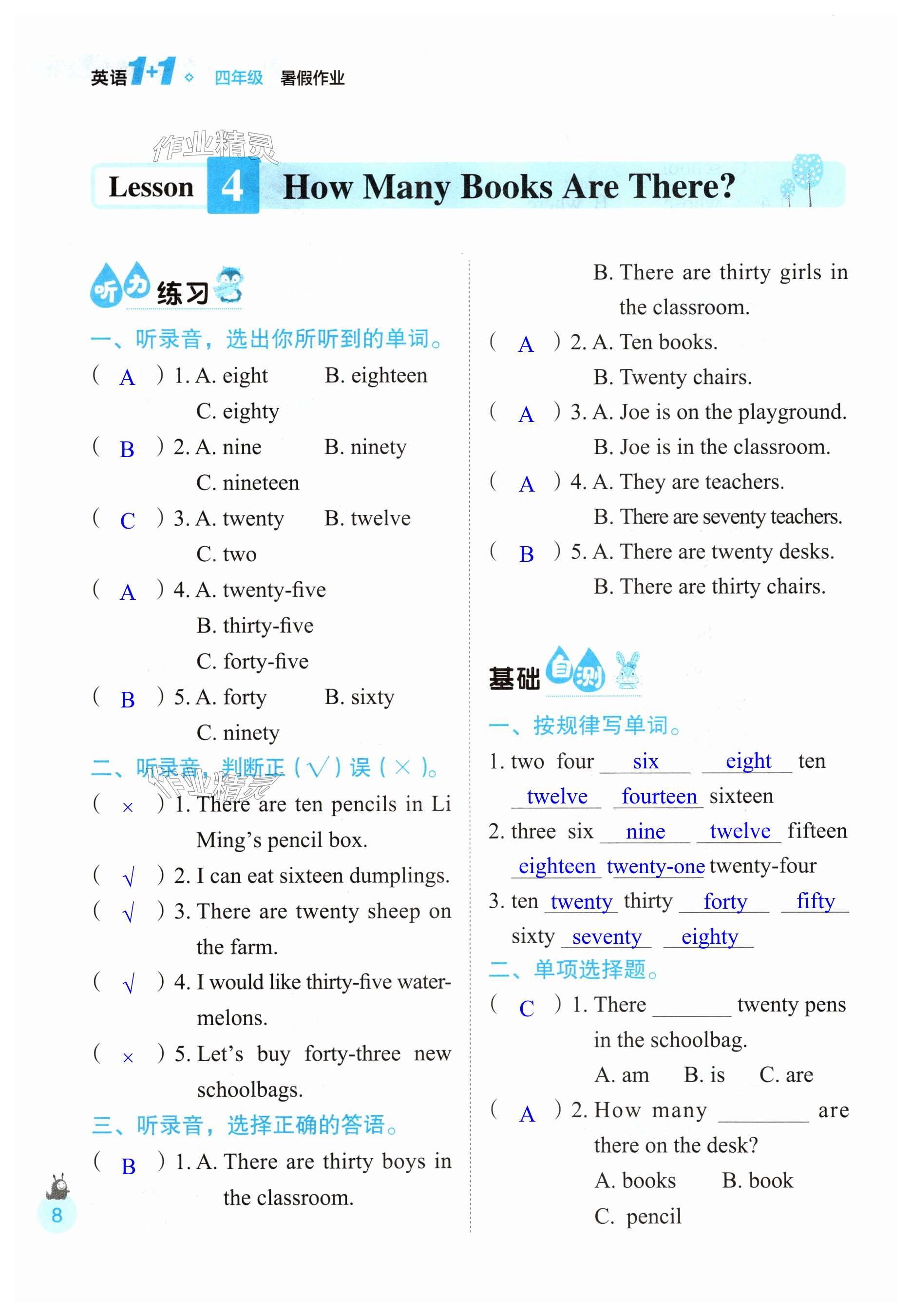 注:目前有些书本章节名称可能整理的还不是很完善,但都是按照顺序排列的,请同学们按照顺序仔细查找。练习册 2025年1+1暑假作业四年级英语 答案主要是用来给同学们做完题方便对答案用的,请勿直接抄袭。