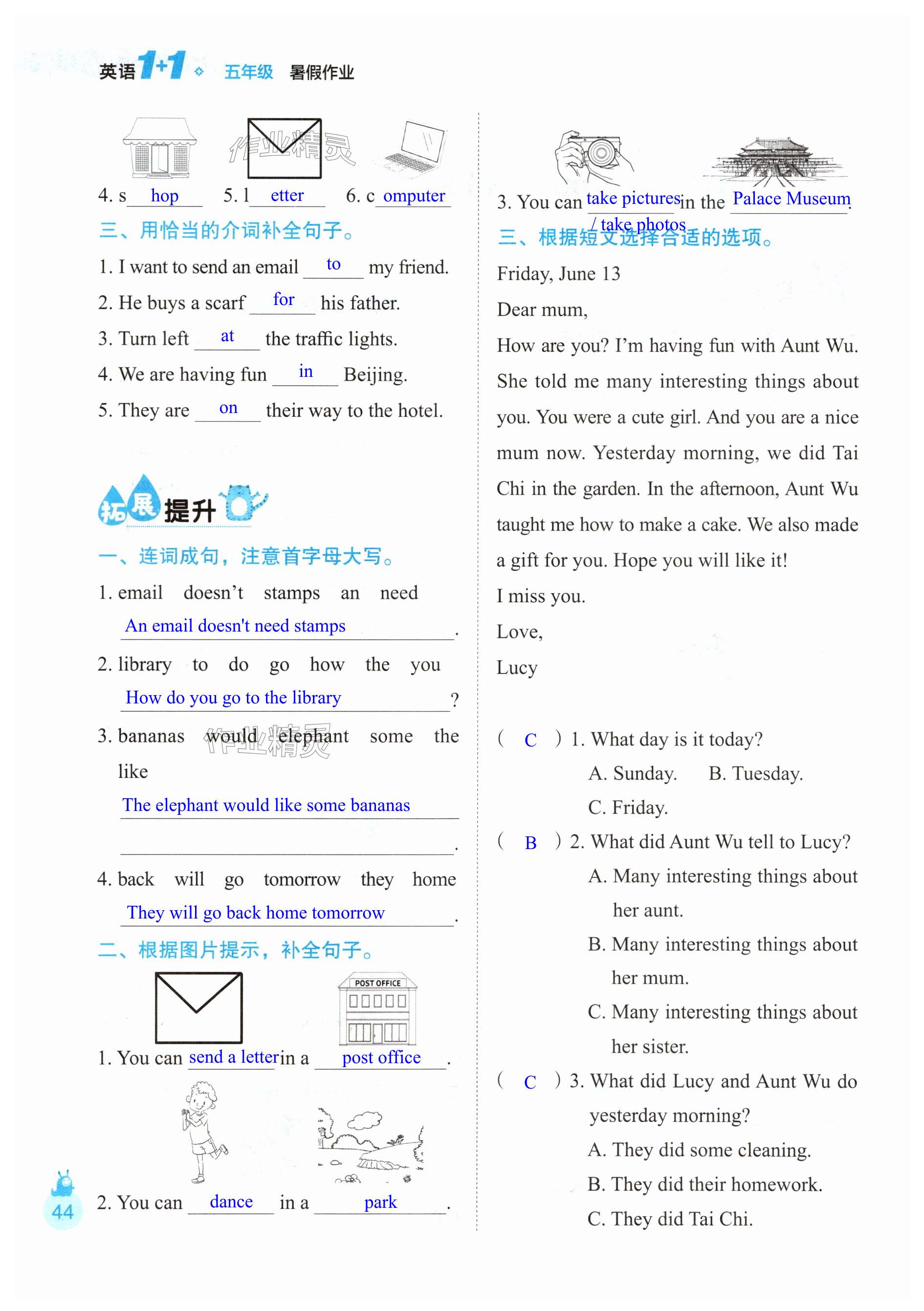 注:目前有些书本章节名称可能整理的还不是很完善,但都是按照顺序排列的,请同学们按照顺序仔细查找。练习册 2025年1+1暑假作业五年级英语 答案主要是用来给同学们做完题方便对答案用的,请勿直接抄袭。