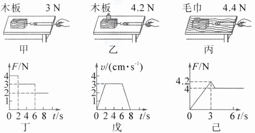 (4)刚开始做第1次实验时控制不好力度,拉力随时间变化的图像如图丁所示,木块的速度随时间变化的图像如图戊所示,则木块在第7s时的摩擦力为