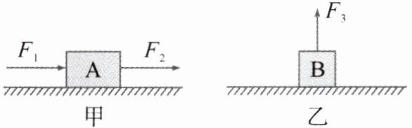 1. 如图甲所示,光滑水平面上物体A受到水平向右的推力$F_{1}= 5N$,拉力$F_{2}= 7N$作用,图乙物体B重30N,现用竖直向上$F_{3}= 45N$的力拉,则A、B两物体受到的合力分别是(