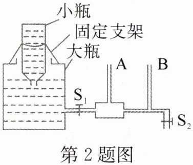 2. 如图所示,装水的大瓶上端开口,下部侧壁开孔,并与粗细不均匀的水平管及竖直的A、B管连通。小瓶装满水后,开口向下倒扣在大瓶中,并固定在支架上。下列说法正确的是(