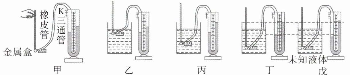 (选填“打开”或“关闭”)状态。(2)若将压强计的金属盒放入水和未知液体两种不同液体中,如图丁和戊,对比U形管中的液柱高度差,得出戊烧杯中的液体密度一定大于水。这个结论