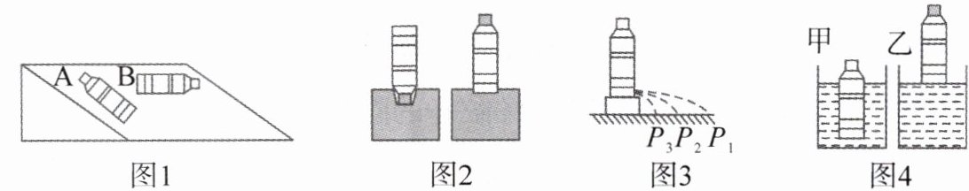 (1)如图1,准备两个一样的矿泉水瓶,将A顺着斜面放在斜面上、B横着放在斜面上后,发现A能够静止不动,B滚下斜面。该现象说明