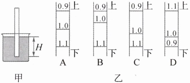 (用$ρ_{水}$、$ρ_{液}$、H表示)。根据以上表达式即可对不同液体的密度在吸管上进行标定。图乙中的四种刻度的标示合理的是C